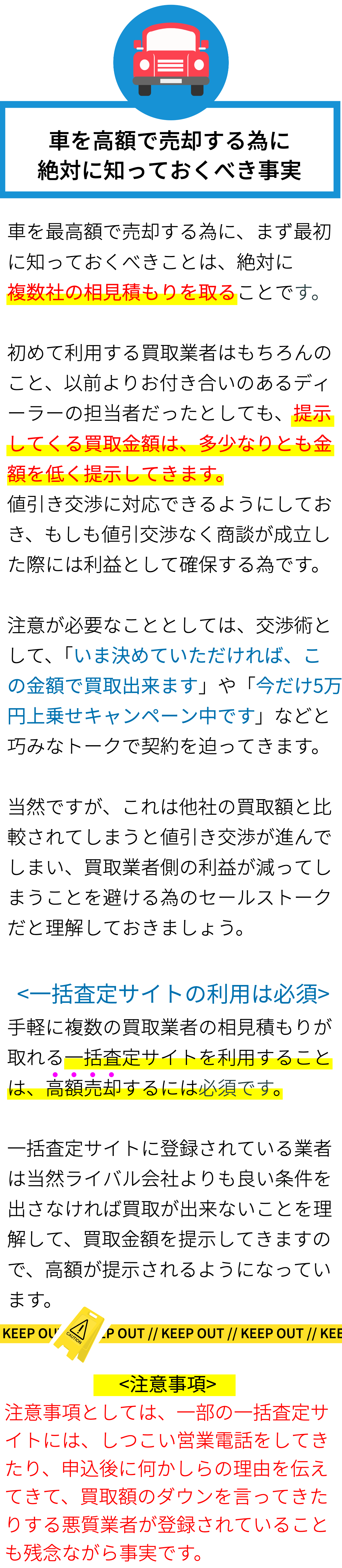 インターネットを活用した車買取一括査定は、複数の業者からの査定結果を簡単に比較できるため、車を高く売るための強力なツールとなります。業者選び、車の状態の整備、正確な情報提供、そして冷静な交渉といったポイントをしっかりと押さえることで、より有利な条件での売却が実現できるでしょう。車の状態を正確に把握し、必要な書類や写真を用意するなど、事前準備を怠らないことが成功の鍵となります。今回ご紹介したポイントを参考に、安心して取引を進めることで、次回以降の車売却においても納得のいく結果を手に入れることができると考えております。